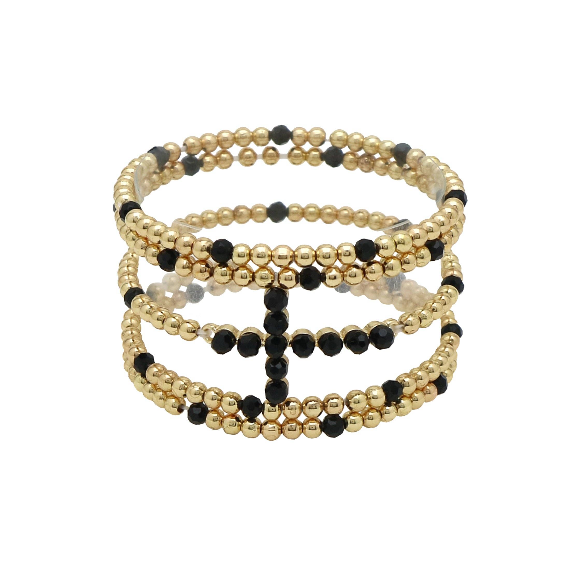 Gold Beaded and Black Cross Set of 5 Stretch Bracelets