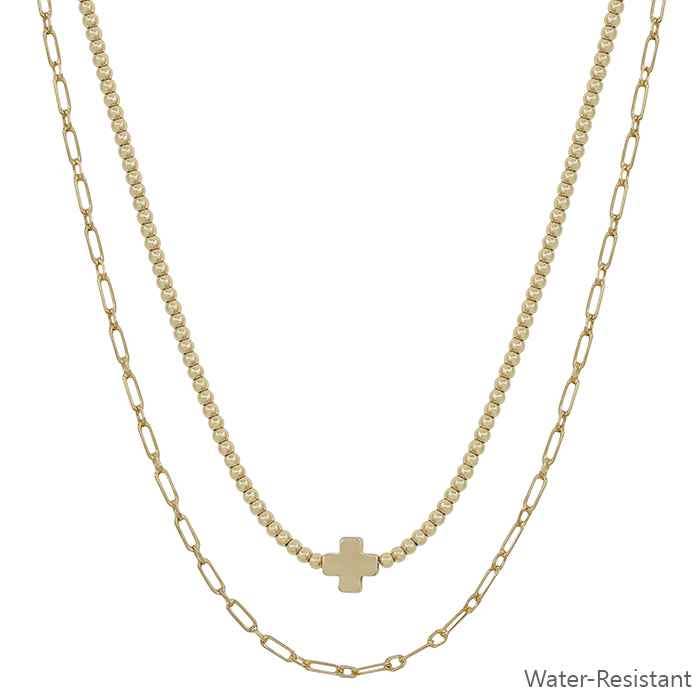 Gold Water Resistant Beaded with Gold Cross Layered 16"-18" Necklace