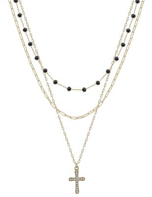 Black Crystal Beaded and Gold Pave Cross 16"18" Necklace
