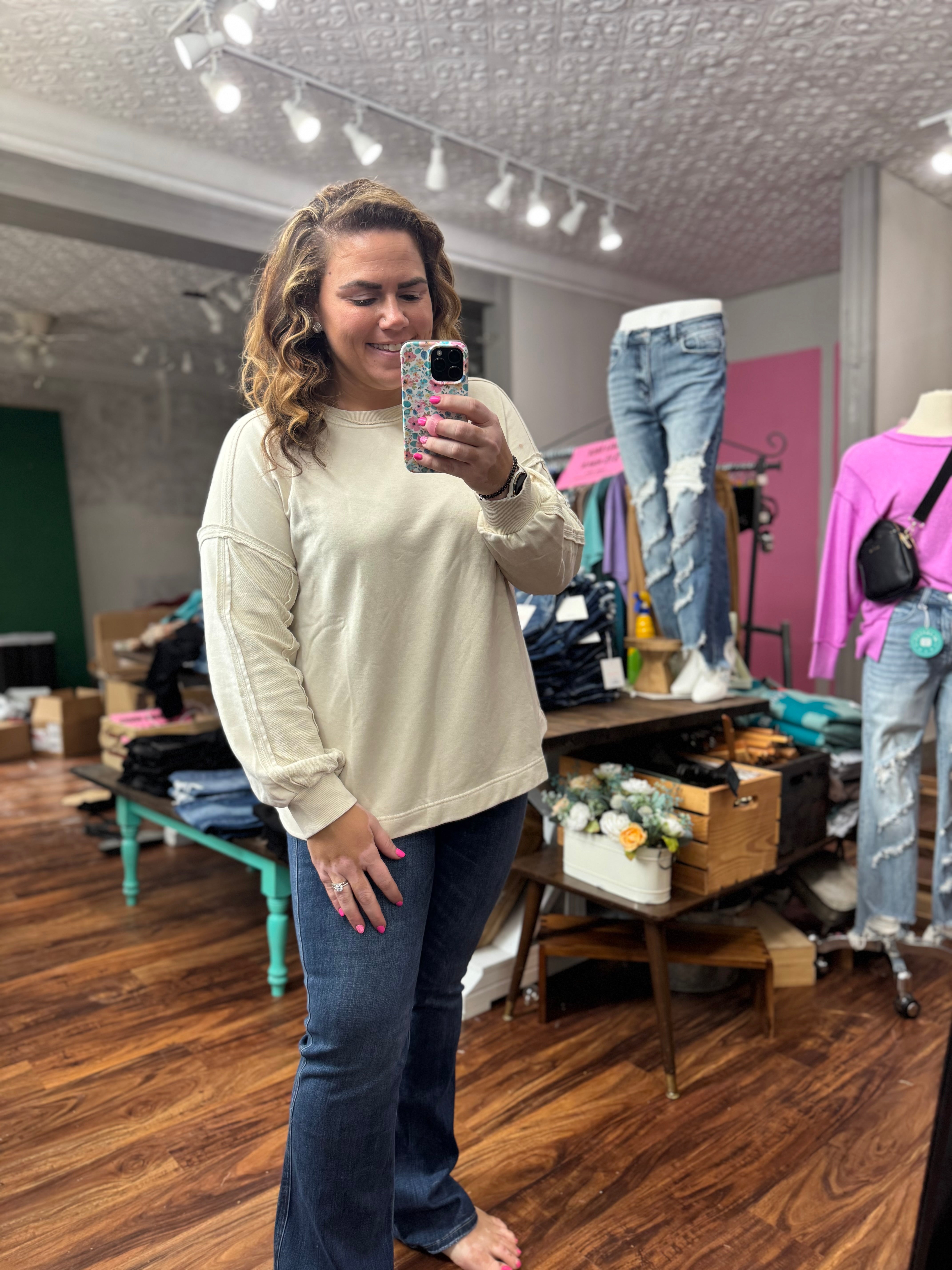 Embrace bold comfort with the Start With Me Cream Sweater. Its relaxed, oversized silhouette and balloon sleeves create a daring statement, while exposed seams add an edgy touch. The crew neckline and dropped shoulders balance casual ease with standout style, making this mineral washed terry pullover perfect for those who lead with confidence and originality.